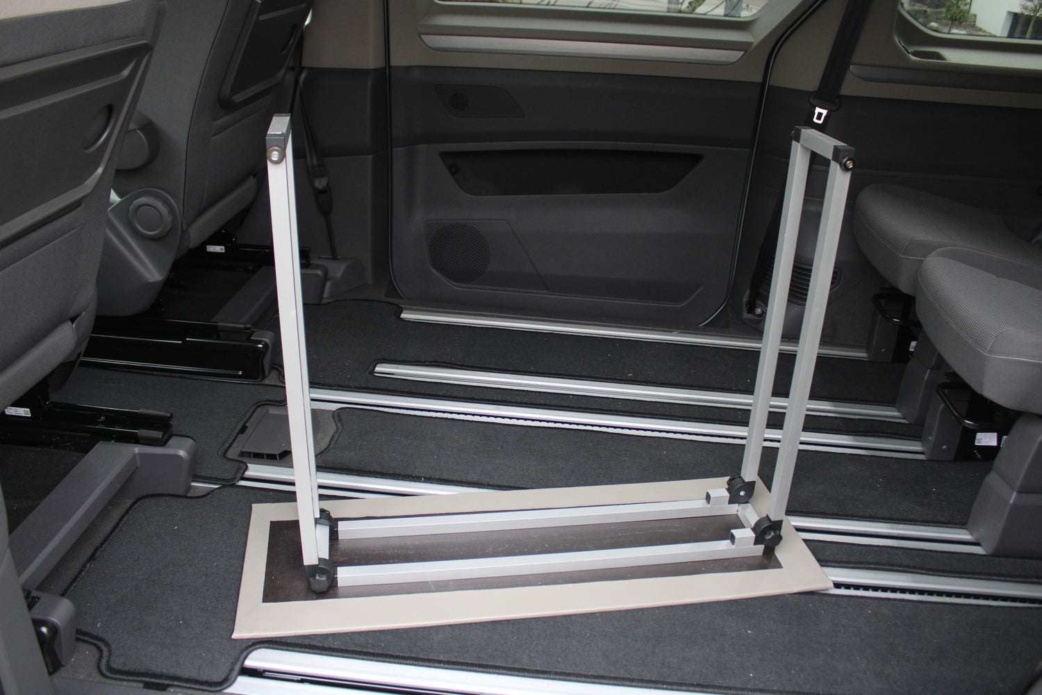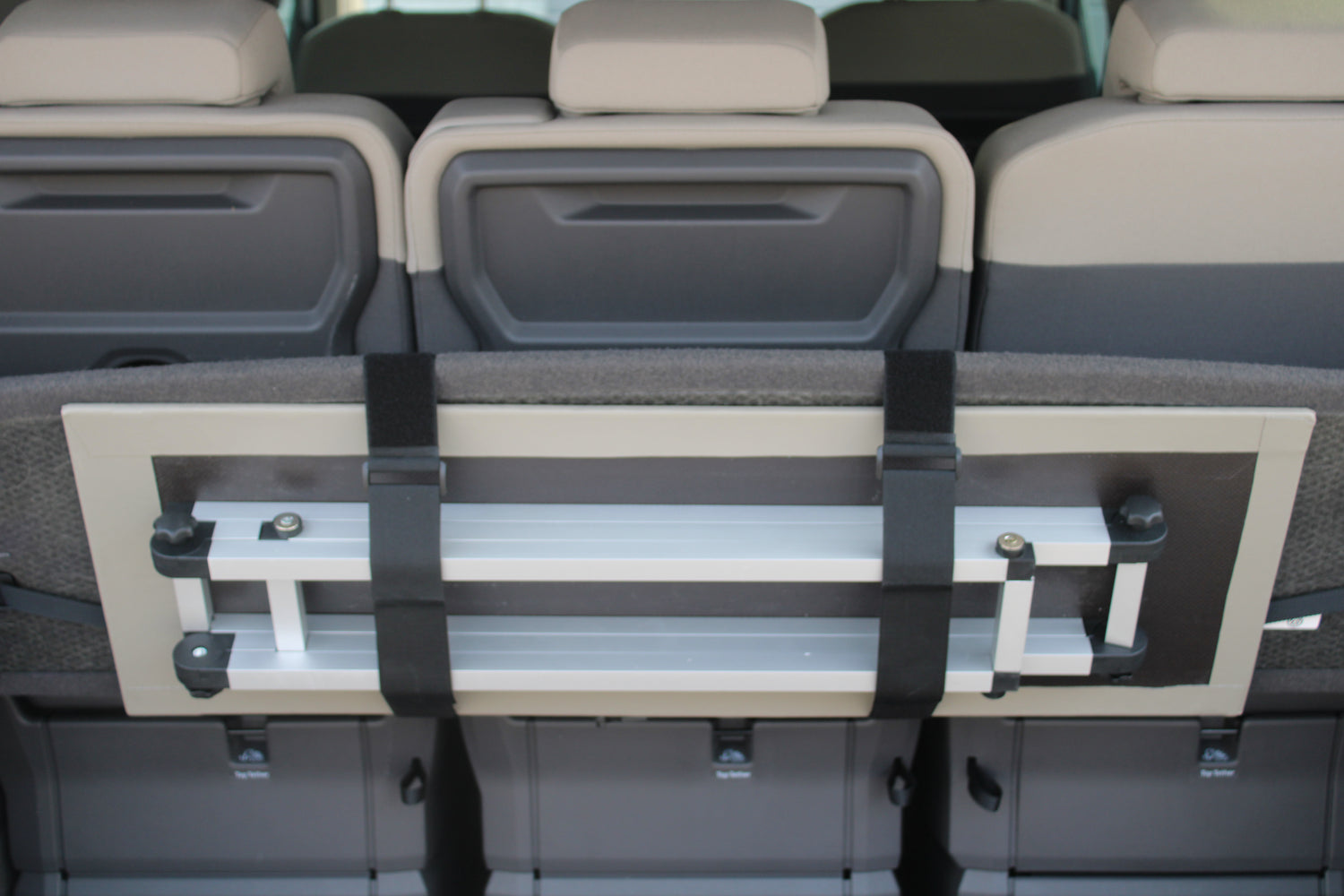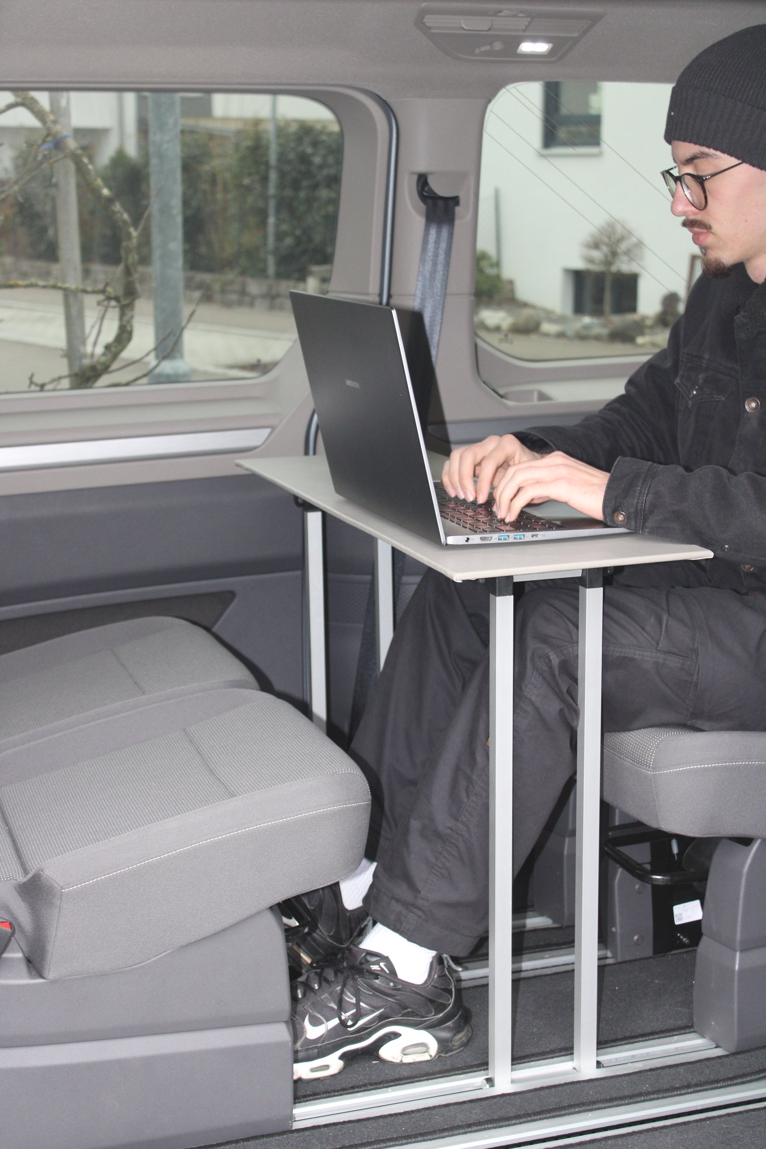 Exklusiver Klapptisch für den VW Multivan T7 – werkzeuglose Montage, nur 2,9 kg, wasserfest. Made in Germany. Perfekt für Camping und mobiles Arbeiten.